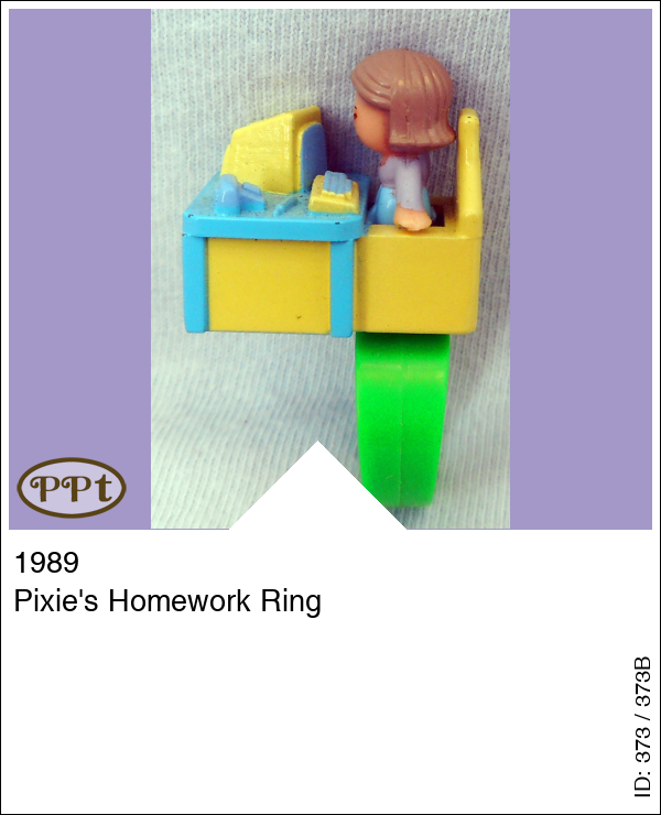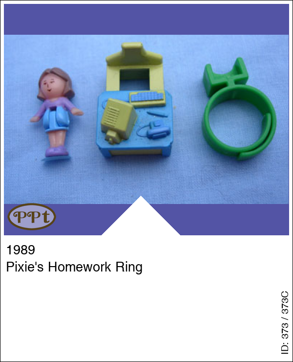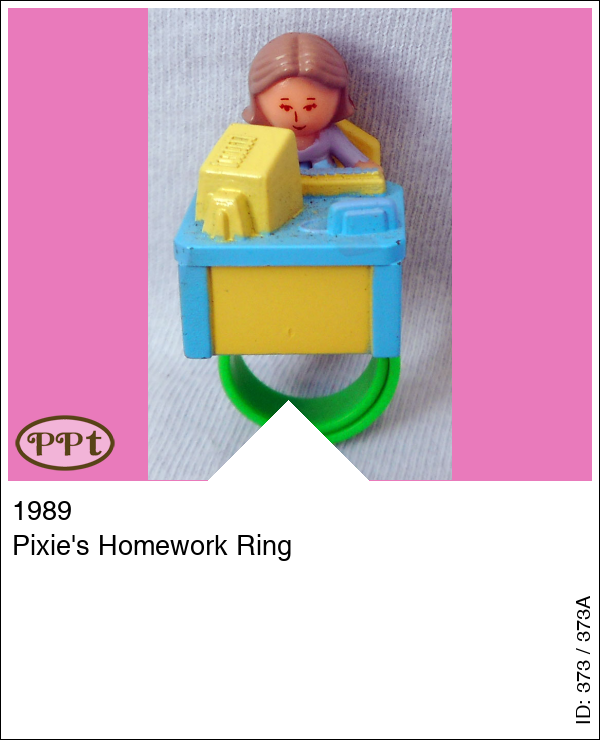 Pixie's Homework RingUpdate: 15-02-2023 Een ring met een blauw tafeltje en gele stoel en op het tafeltje is Pixie haar huiswerk aan het maken met de computer. Met Pixie en de groene ring.
