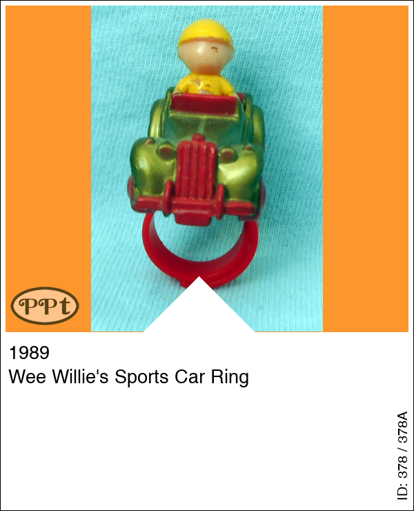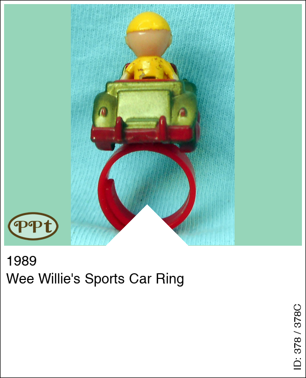 Wee Willie's Sports Car RingUpdate: 21-02-2023 Dit is een ring met een goudkleurige/rode oldtimer auto met Wee Willy en rode ring.
