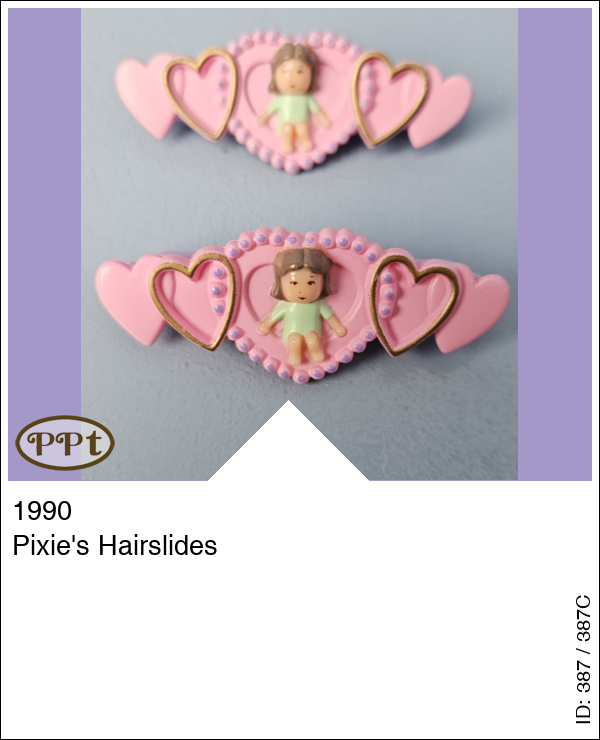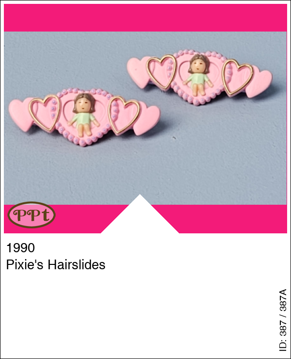 Dit zijn 2 roze haarspeldjes met hartjes en het poppetje Pixie.