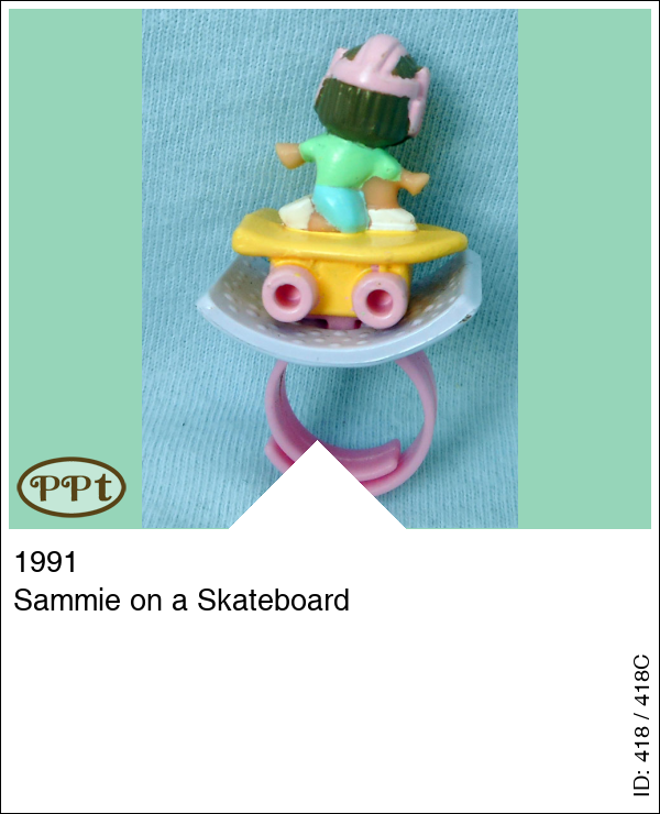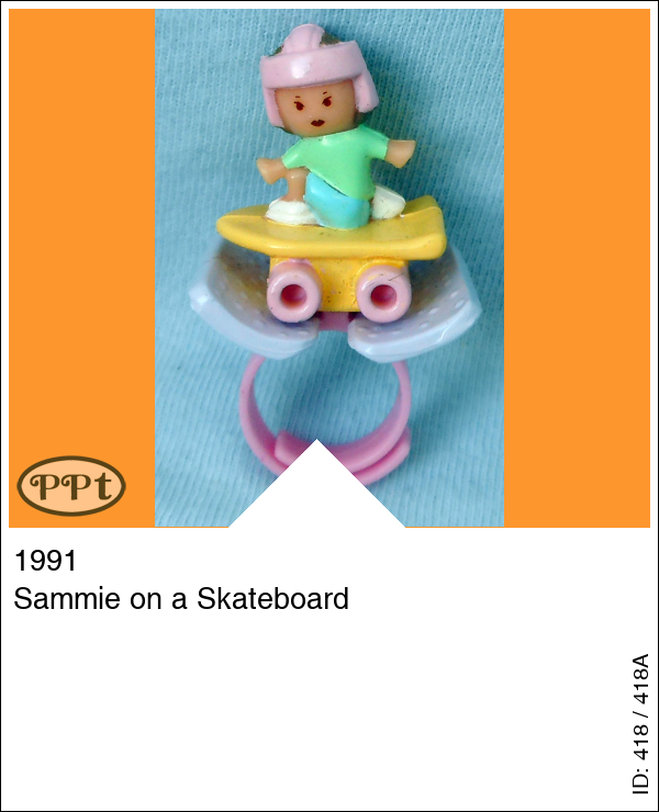Sammie on a SkateboardUpdate: 21-02-2023 Dit is Sammy op zijn skatebord, hij zit alleen wel vast erop je kunt alleen de ring loshalen, en het losse lila surfplaatje.