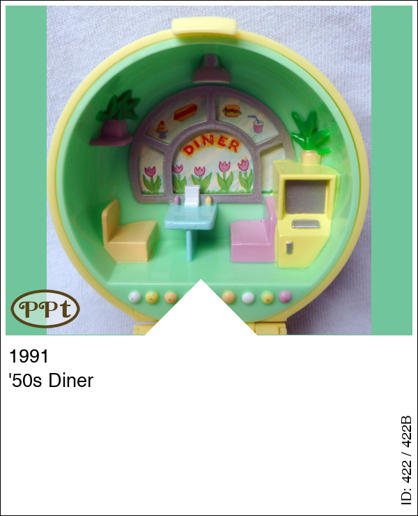 Dit ronde gele hoge doosje is van binnen een drive-in restaurant met zithoek en kassa. Hier hoort een ring in het midden met een roze auto en dan kan je bestellen. Met Polly en de chefkok met het menubord in zijn hand, roze auto, groene ring.