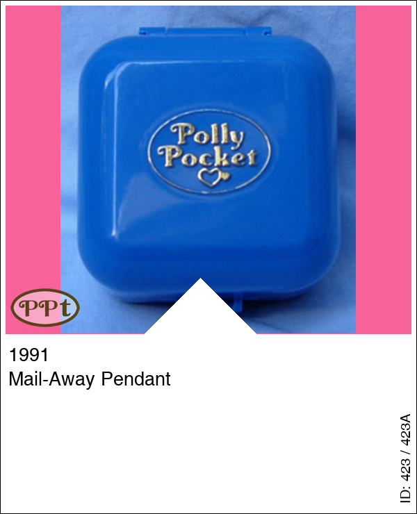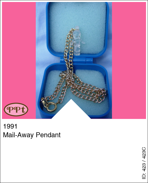Mail-Away PendantUpdate: 21-02-2023 Uniek doosje met binnen in een halsketting met daaraan Polly in doorzichtig glas.