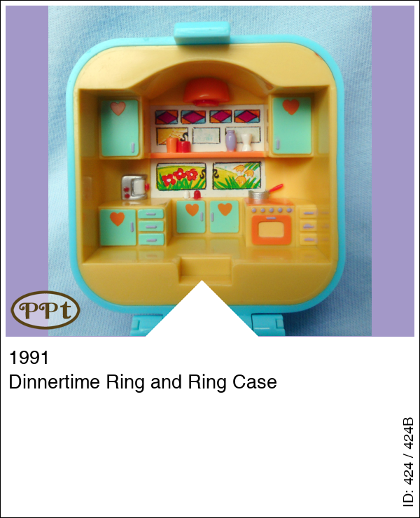 Een blauw vierkant hoog doosje met binnenin een keukentje en aan de andere kant staat de eettafel met lekkere dingen en dat is tevens een ring. Met polly in rode jurk, het bruine staande hondje, en de groene ring.