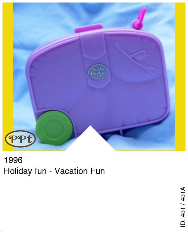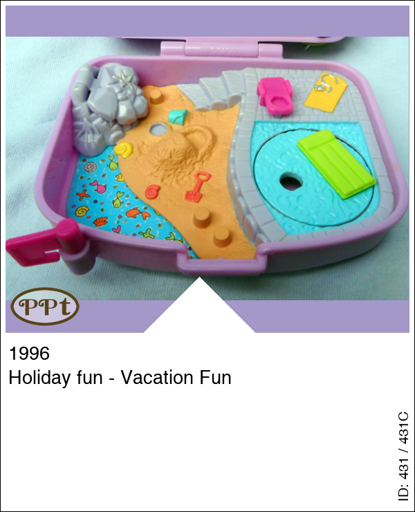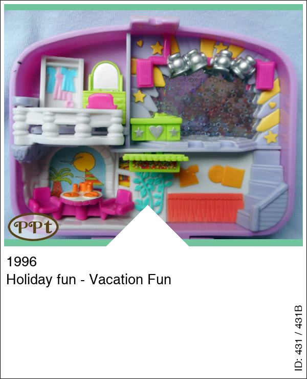 Een leuk paars koffertje met binnenin een zwembad aan de zee met een zandstrand en daar ligt een hoopje zand waar een popje in kan liggen, een rotspartij welke open kan en daaronder ligt een krab, bij het zwembad heb je een duikplank en polly kan echt in het water, in het water ligt een luchtbed. Bovenin is haar hotelkamer met kast waar je tevens een bed van kan maken als je het balkon opzij klapt, er staat een kaptafel. Je ziet de bar met los zitje en een disco met glitterwand. Met Annie met fototoestel in haar hand, Polly met zonnebril en stickertjes.