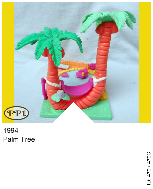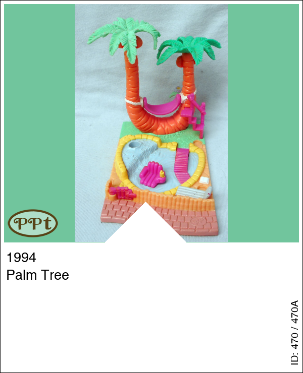 Dit is een eiland met een zwembadje en palmbomen. In de bomen hangt een hangmat en die beweegt echt. De stoel in het zwembad draait en het bruggetje kan omhoog. Polly kan ook in het zwembad zitten. Met Polly en paarse fiets.