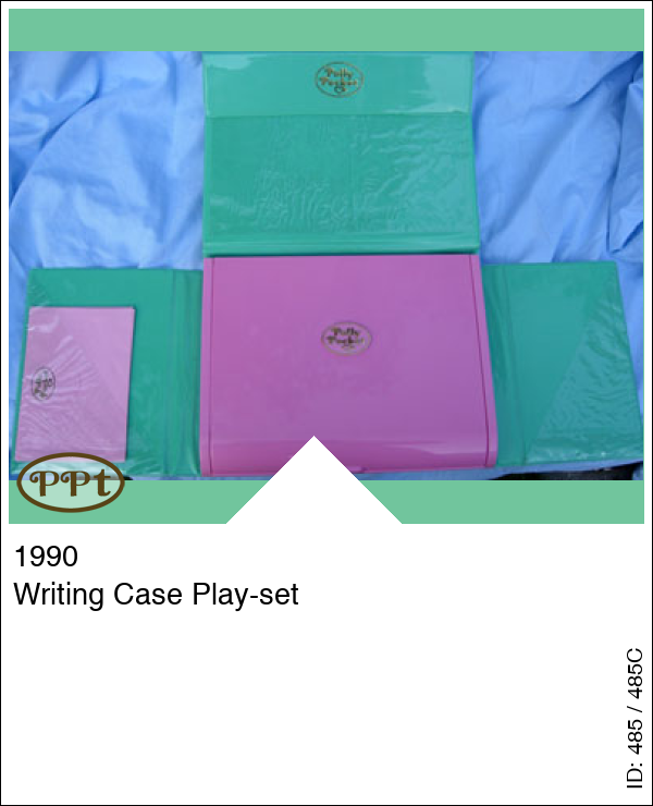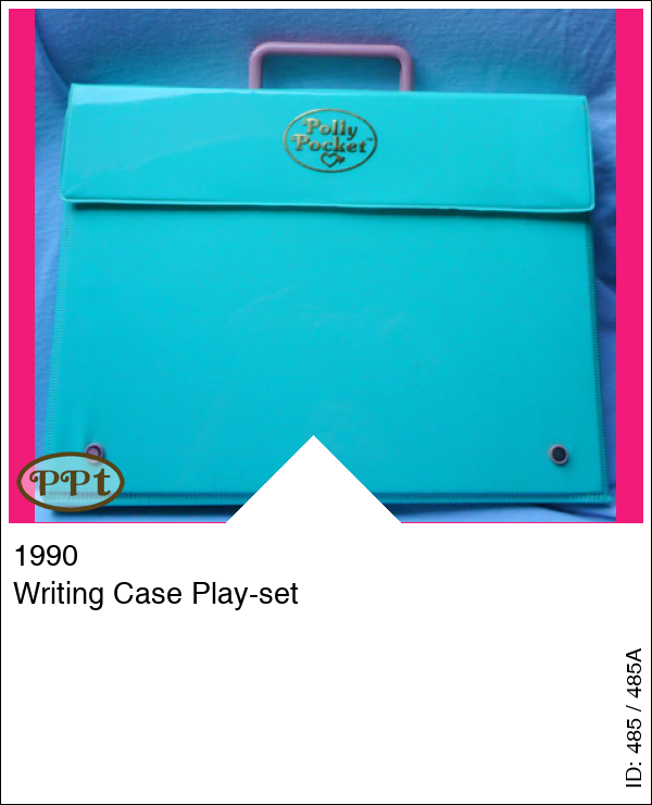 De groene koffer met binnenin de writing-case Als je deze doos open doet dan zie je op de deksel een 16 tal soorten poppetjes die er zijn in de collectie pp, compleet met naam, en ook 9 soorten diertjes, deze hebben geen naam. Verder zitten er vakjes in voor potloden, lineaal, gum, puntenslijper enz. en aan de voorkant kun je spelen met Polly pocket, want daar zie je een slaapkamer met allerlei wasgoed op de vloer, nog een slaapkamer maar deze is netjes, een schrijfkamer met toilettafel en tv en poesje en dan heb je nog een ruimte buiten met steentjes vloer en een auto op de achtergrond. Met baby en Polly met blauw petje op, Titch, Tiny Tina, Minny, 2 potloden, gum, puntenslijper, papier en envelop met logo van Polly pocket.