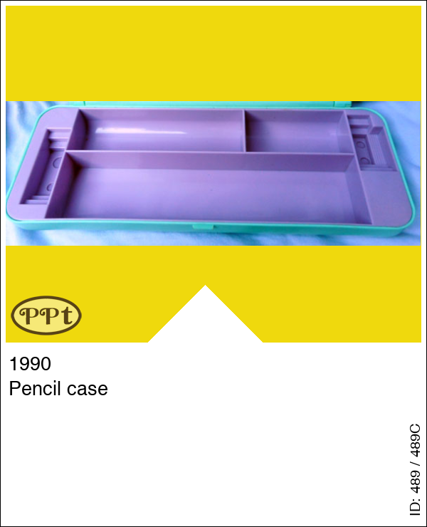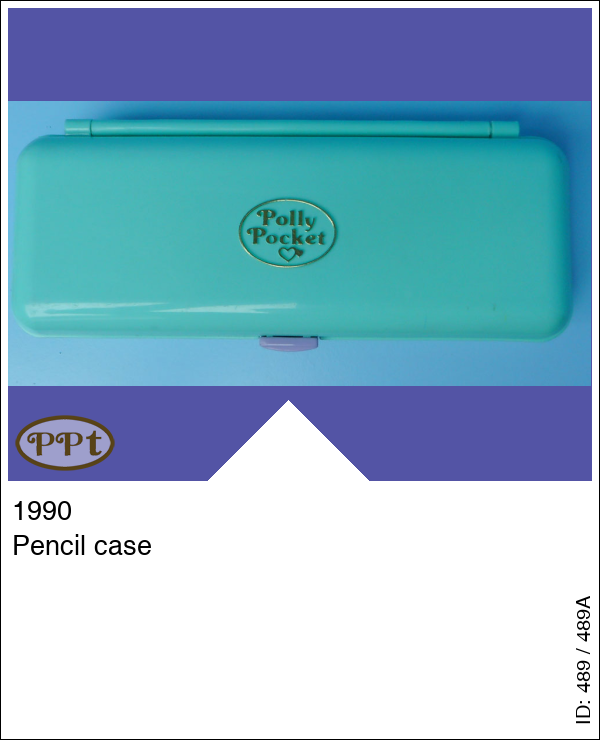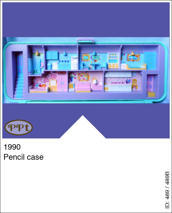 Een groene langwerpige pennendoos met binnen en dan zie je aan de ene kant een boven en beneden woning. De bovenste woning daar is alles blauw en de onderste woning daar is alles roze. Bij allebei de woningen zie je een keuken, woonkamer en slaapkamer. Aan de andere zijde daar kun je de pennen en gum en poppetjes leggen. Met Polly, Midge en Wee Willy en het zwarte poesje, puntenslijper en stolpje, potlood, gum.