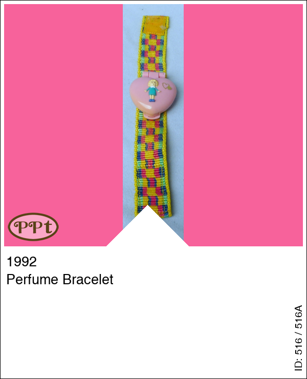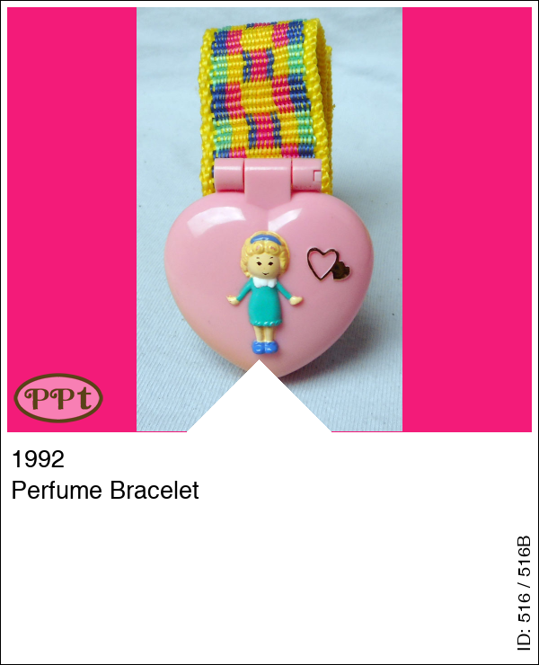 Deze armband met leuke kleurtjes is versierd met een roze hartjes doosje met aan de voorkant een afbeelding van Polly in groen jurkje. In dit doosje heeft een parfum-creme gezeten en de binnenkant van het doosje is geel. Er horen geen poppetjes bij.