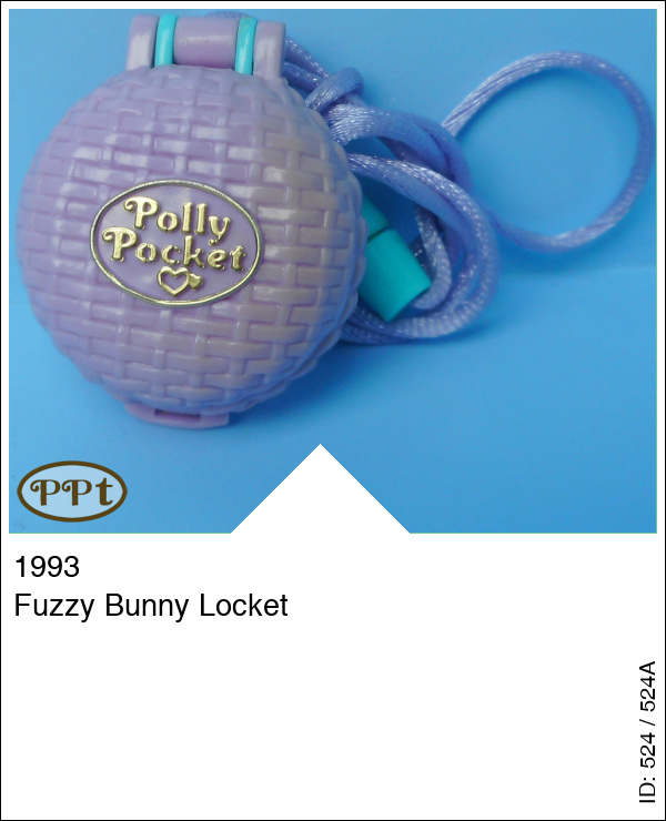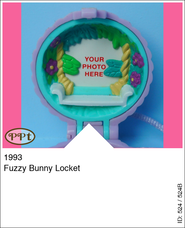 Een halsketting met een paars doosje eraan. Binnen in is aan de ene kant een bankje en je kunt hier een foto achter doen. Aan de andere kant zie je een paar kussens en een geel konijnenhok met een bruin konijntje. Compleet met Polly en konijntje Hutch.