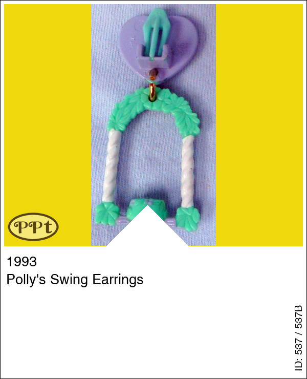 Polly's Swing EarringsUpdate: 17-02-2023 Paars hartje waarop 2 kleine paarse hartjes zitten en hieronder hangt een prieeltje aan met bloemetjes waar Polly in kan staan.