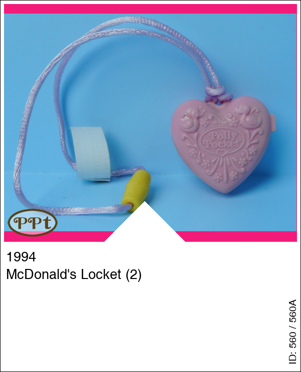 Dit is een halsketting met een roze hartje. Dit kreeg je bij McDonalds bij je Happy Meal. Binnen kun je links een foto doen en rechts is een schommeltje met Polly erop en je ziet op de achtergrond een boom en vlinders en een ondergaande zon.