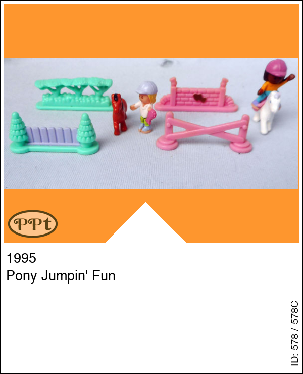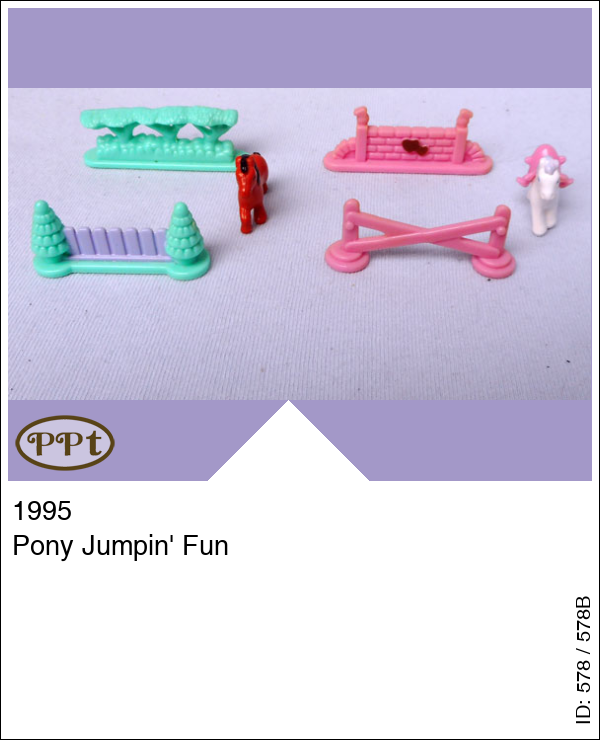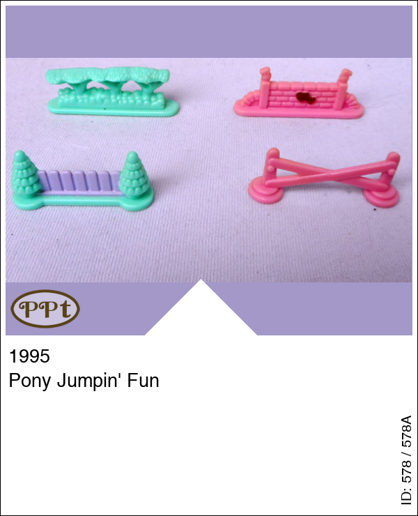 Dit zijn 4 verschillende spring hekjes, 1 blauwe met boompjes, 1 blauwe met 2 boompjes en een paars hekje ertussen, 1 roze met gekruiste palen, 1 roze muurtje met gouden hartjes. Het bruine paardje kan erover heen springen en het witte paardje met paarse staart en paarse manen en roze zadel kan er ook overheen springen.