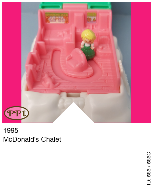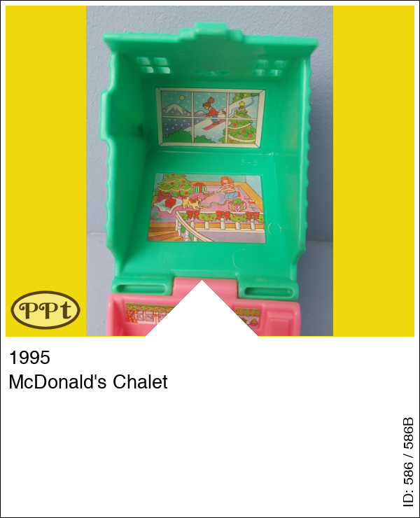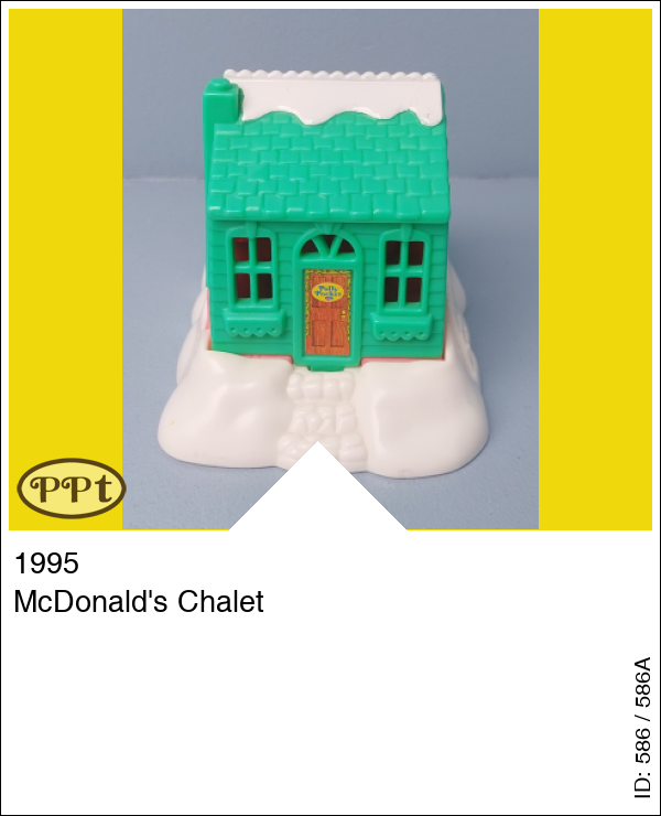 Leuk klein alpine huisje op een besneeuwde ondergrond. En binnenin is een lekker knus huisje met wat stickers en daarop is een afbeelding te zien van een besneeuwde helling met een persoon die naar beneden ski, en een plaatje met kerstboom en kado's, ook ligt er een hondje voor de open haard. Er staat een polly vast in en dit popje beweegt als je aan het wieltje draait onder het huisje.