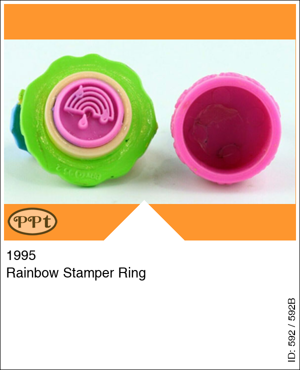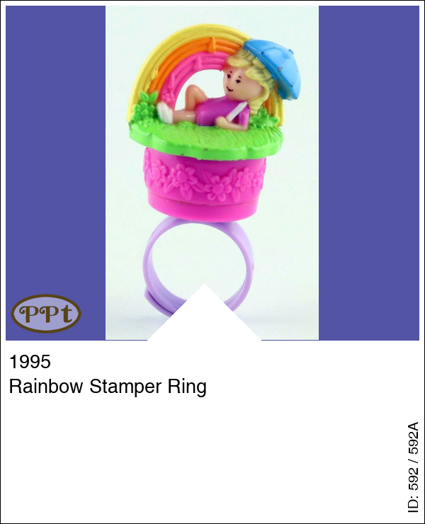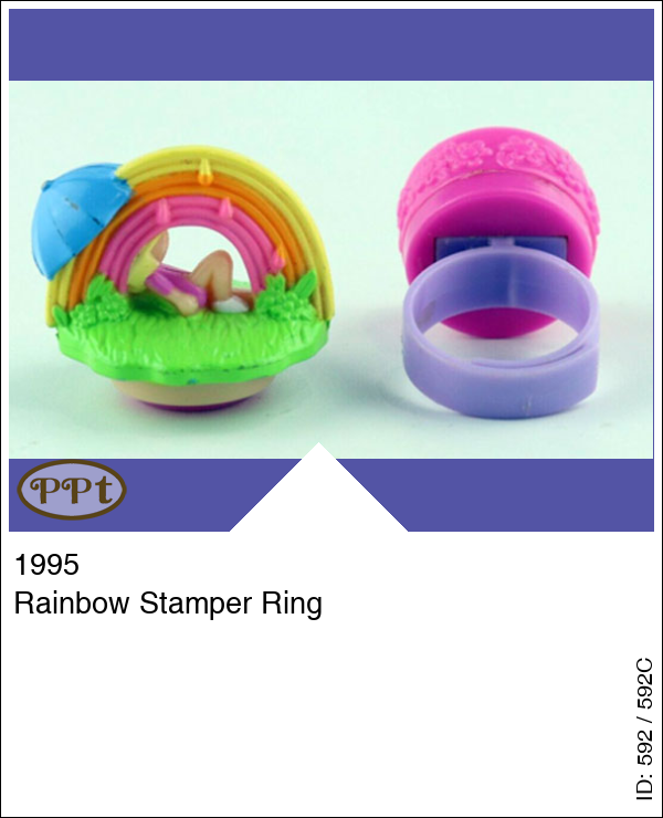 Rainbow Stamper Ring Super leuke ring met Polly liggend op een grasveld met blauwe parasol en je ziet een regenboog. De stempel is een afbeelding van een regenboog.