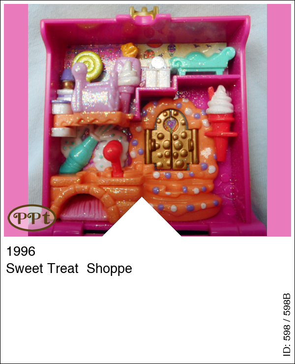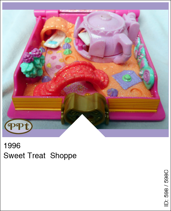 Dit is een roze boekje met daarop een sleutel(deze ontbreekt). Binnen zie je heel veel glitters en een theepot die open kan en in die theepot zie je een ijssalon. Ook vaart er een bootje op en neer door een roze gracht. Bovenin zie je een glitterbed met ijsjes en lollies. En achter de gouden deurtjes zie je een glitterstoel met allemaal lekkers. Met Tiny Polly, een vriendin, Gingerbreadman (oranje).