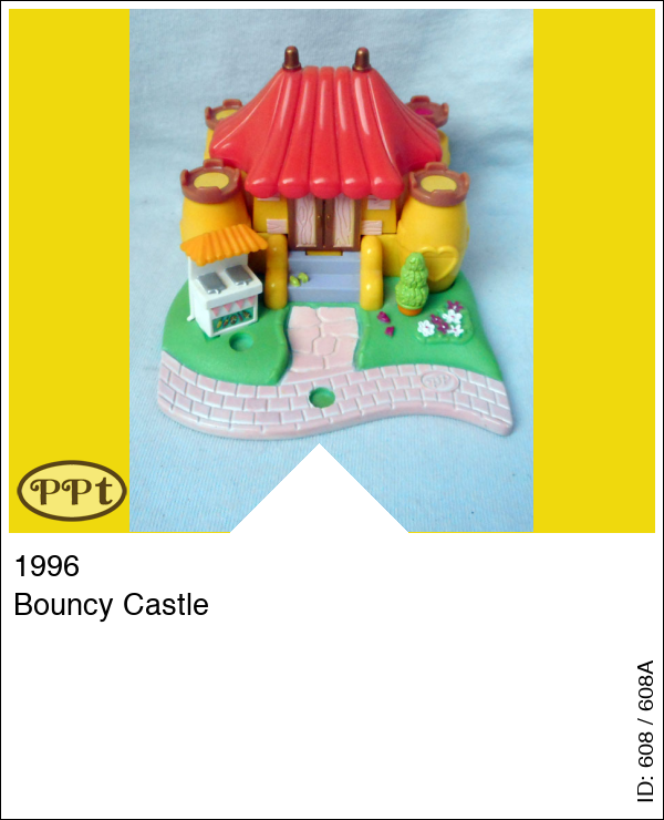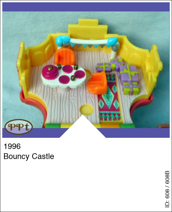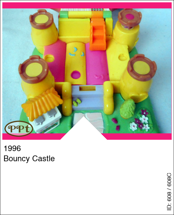 Leuk huisje in de vorm van een kasteeltje met daarbinnen een springkussen en als je op het achterste torentje drukt dan kan Polly op de trampoline springen. Bovenaan is een feestje met een gedekte tafel met taart en er liggen cadeautjes op de grond. Buiten staat een ijsco karretje.