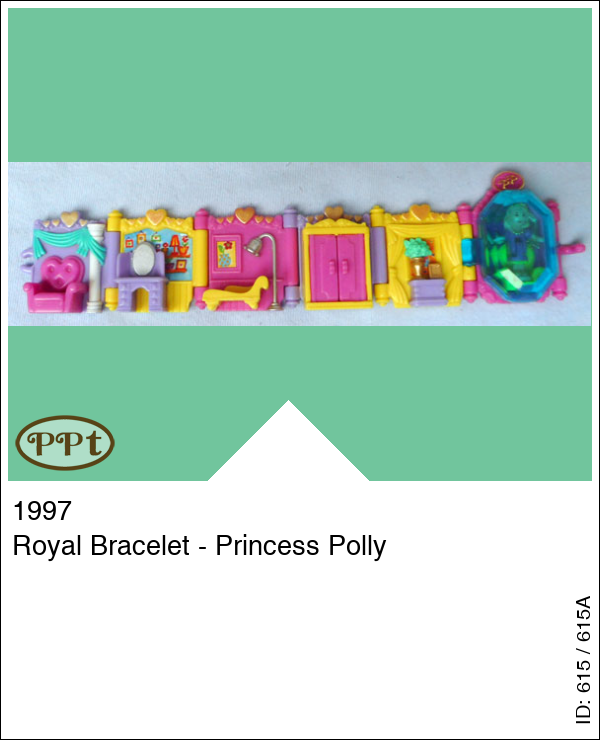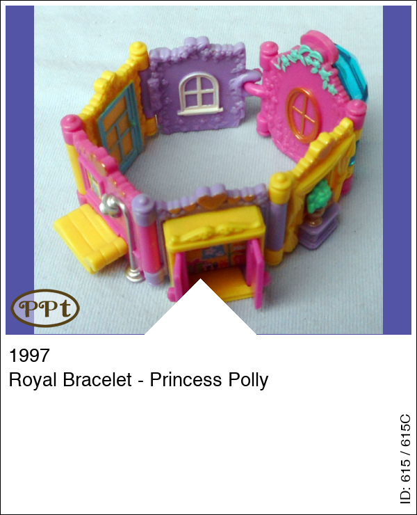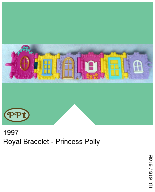 Dit is een armband met allemaal deurtjes en raampjes en als je het omdraait dan zie je achter elk van raampje of deurtje iets huiselijks, bijv. een stoel, kaptafel, relaxbank, kast waar de deurtjes van open gaan, plantentafeltje en een luikje wat openkan en daarachter staat polly met kroontje en parelketting op de stoel.