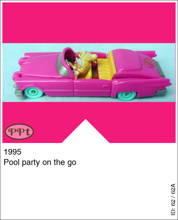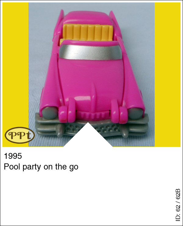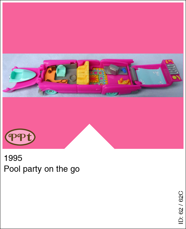 Een limousine met in de binnenkant onder de motorkap een stoel en make-up tafel en onder de motorkap zit de jetski, onder de achterbak zit een tv en je kan ook even het zwembad in. 1 deurtje van de auto kan open en de voorbank kan je wegdraaien. Met Polly, jetski en surfplankje