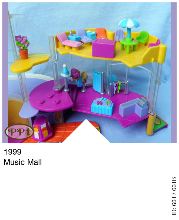 Dit is een winkelcentrum waar op de begane grond boeken en muziek verkocht worden, als je met de lift omhoog gaat naar de volgende verdieping dan kom je bij de kledingwinkel waar hoedjes, jurkjes en schoenen verkocht worden. De volgende verdieping is het dakterras waar je 3 ligstoelen staan en een tafel met 3 stoeltjes en een vrieskast met ijsjes waar je de deksel van open en dicht kan doen. Je kunt met de paars/roze auto de helling oprijden van het winkelcentrum. Met Polly, Lila en Lea.