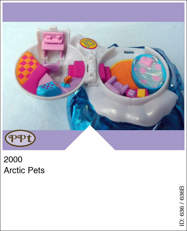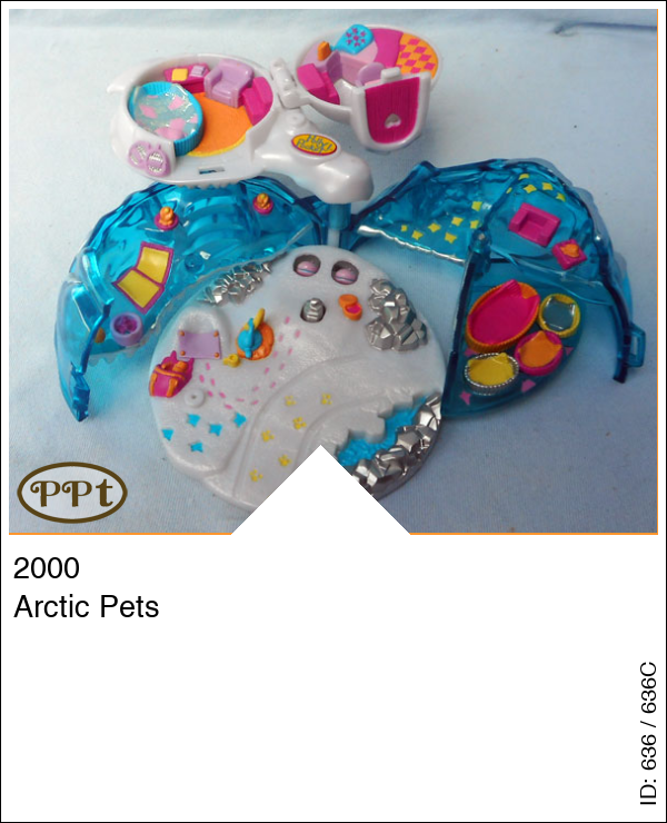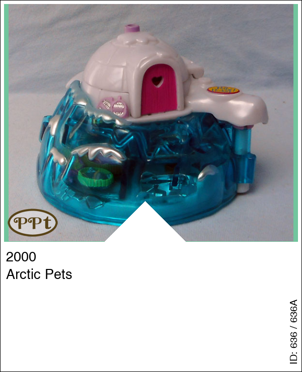 Dit is een iglo huisje wat boven op een blauwe berg staat. Als je de iglo opent dan zie je een knus huisje met grote mand en stoel, bed en kaptafel. Het onderste gedeelte draai je open en dan gaat er een fantastische ijswereld open met een pannetje op vuur, als je op een zilver bergje drukt komen er 2 visjes omhoog, zithoekjes en dan nog een klein verborgen hokje daar zitten de mandjes voor de pinguins. De slede met 3 honden ervoor, Polly, moeder-pinguin en 3 baby-pinguins.
