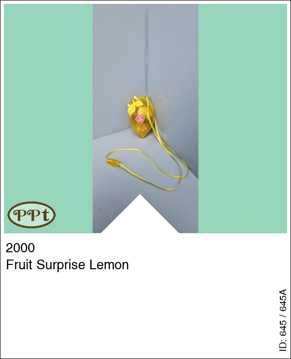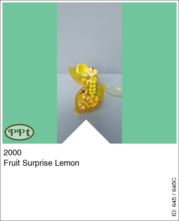 Dit is een halsketting met hieraan een citroen. Binnenin zie je boompje en dit kun je openklappen en hieronder zit een picknick kleedje onder. In de citroen zie je een tafel wat je open kan klappen met verschillende spulletjes erop. en op de grond staan wat mandjes met citroenen. Met Polly in haar rokje en de gele ladder.