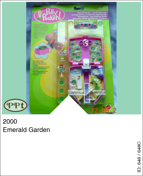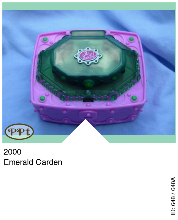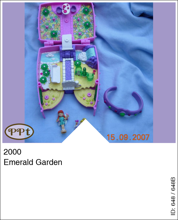 Dit vierkant doosje met bovenop een groen dakje en als je dat optilt zie je een armband. In het doosje is een tuin met bruggetje en waterval en bankje. De voorkant kun je uitklappen en als je onder het bruggetje drukt gaat het padje open. De bloemetjes kun je anders wegzetten. Met Fairy Polly en Fairy Lea en 8 groene smaragd bloemen en het paarse armbandje.
