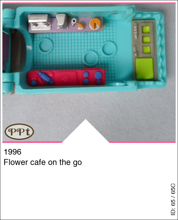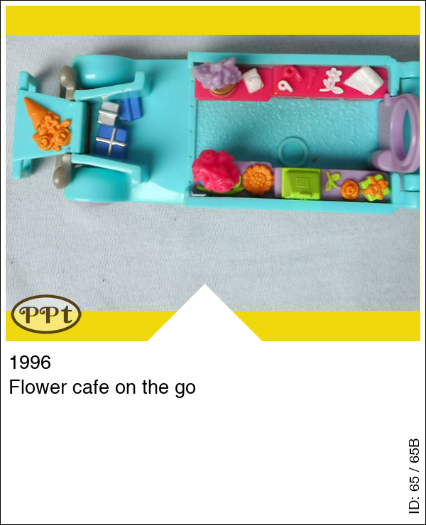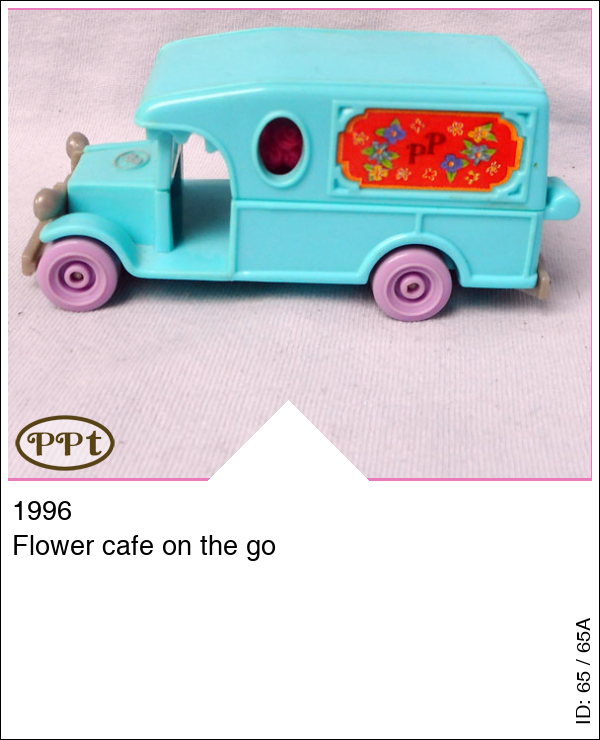 Dit is een blauwe ouderwetse bus als bloemen shop en cafe on the go. In de bloemenwinkel staan enkele bloemen, plantjes en een inpakbalie. Ook een kassa om je bloemetjes af te rekenen. Aan de andere kant van de bus kun je lekker koffie bestellen met taart en op de picknicktafel opeten. Onder de motorkap liggen cadeautjes. Met Polly, Cathie, picknicktafel.