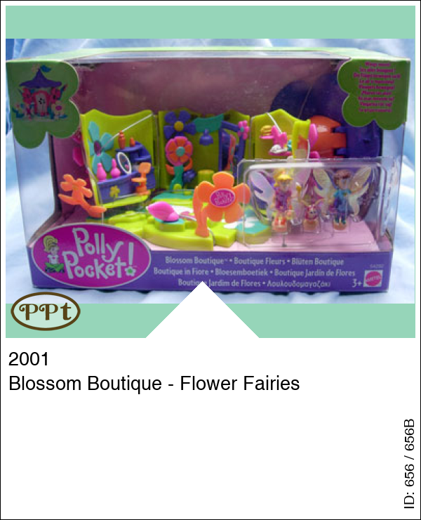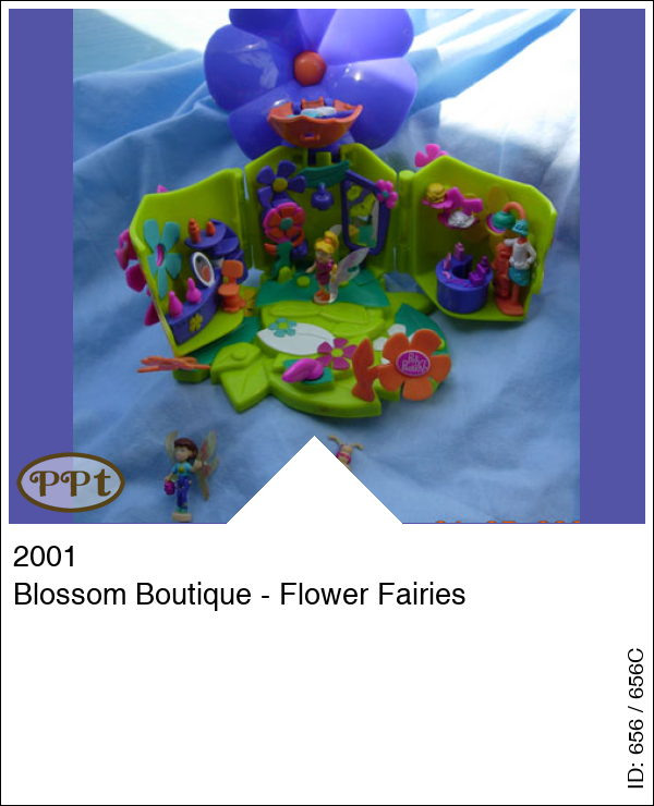 Deze bloem heeft ook iets geweldigs binnenin, het is namelijk een boutique. Met o.a. een kledingwinkel een parfum/kapper winkel en in het midden een showroom met grote spiegel en wanneer ze hiervoor gaan staan op het speciale vakje dan beweeg je met een schuifje en de vleugels beginnen te bewegen van blijdschap geweldig om te zien. Onder de paarse bloem zit nog een vakje en daaronder is een bedje verstopt. Met fairy Polly en fairy Lila en een klein lieveheersbeestje.