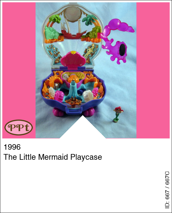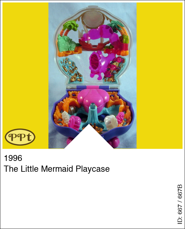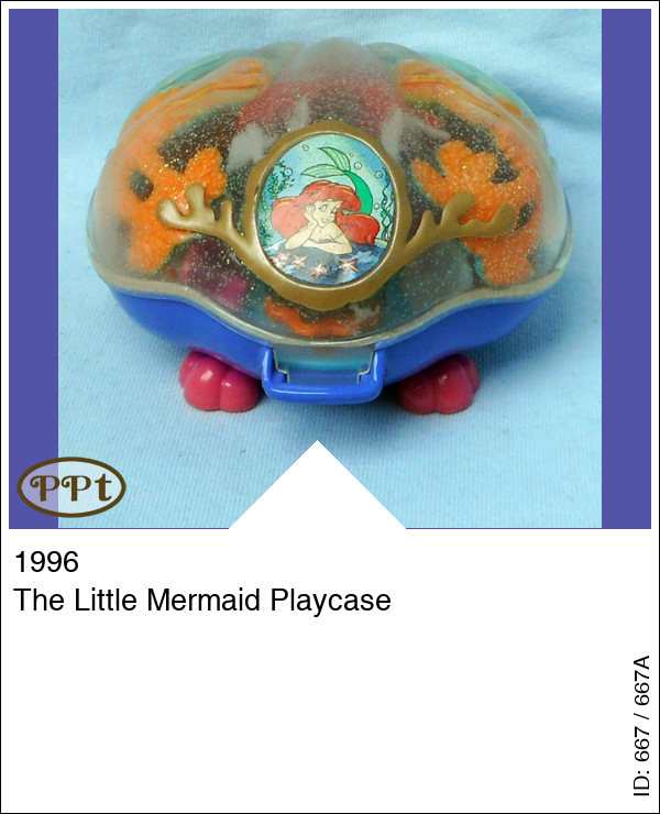 Dit is een doorzichtige schelp aan de bovenkant en onderkant is paars. Je ziet een plaatje van Ariël. Als je deze schelp openmaakt dan zie je in het bovenste gedeelte de onderwaterwereld met allerlei verzamelde spullen van Ariël en boven water de boot van Prins Eric. Onderin zie je de wondere water wereld met een roze schelp die open kan, een klein schatkistje,2 stoeltjes en als je aan het blauwe knopje draait dan beweegt de grond en gaan er 2 schelpjes open en dicht.