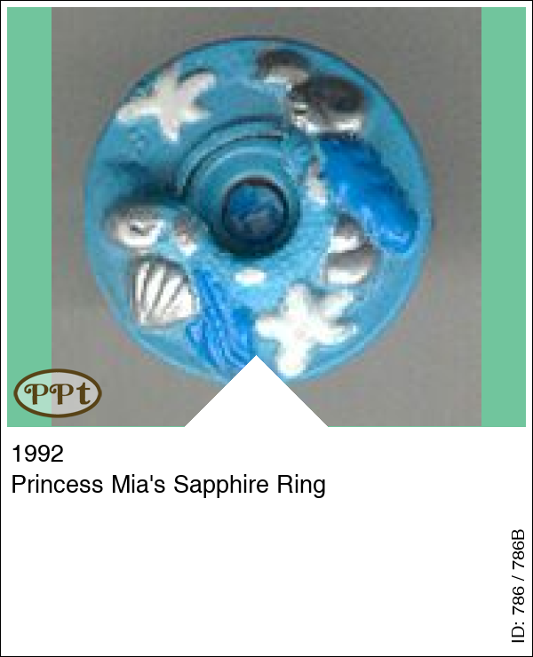 Princess Mia's Sapphire RingUpdate: 23-08-2025 Een leuke blauwe ring met schelpjes en boven op de ring Princess Mia met kroontje.