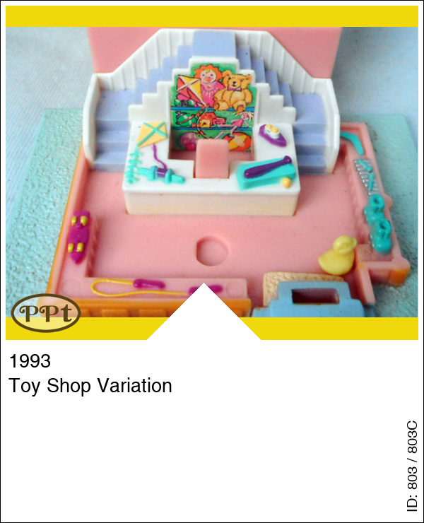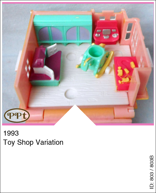 Een speelgoedwinkel met een toonbankje waar speelgoed op ligt, via een trap ga je naar boven waar een schommelpaard staat, een racebaan, een poppenhuis en een kast. Aan de buitenkant van het huisje zie je een glijbaantje en een vliegtuigje. Ook is er een etalage waar wat speelgoed in ligt o.a. een beertje. Met Polly en Mimi.