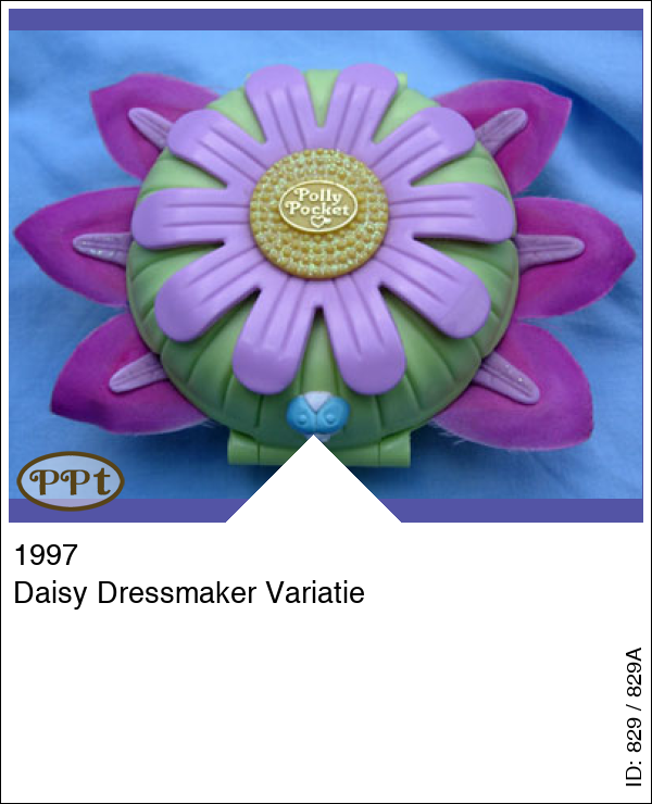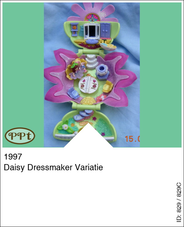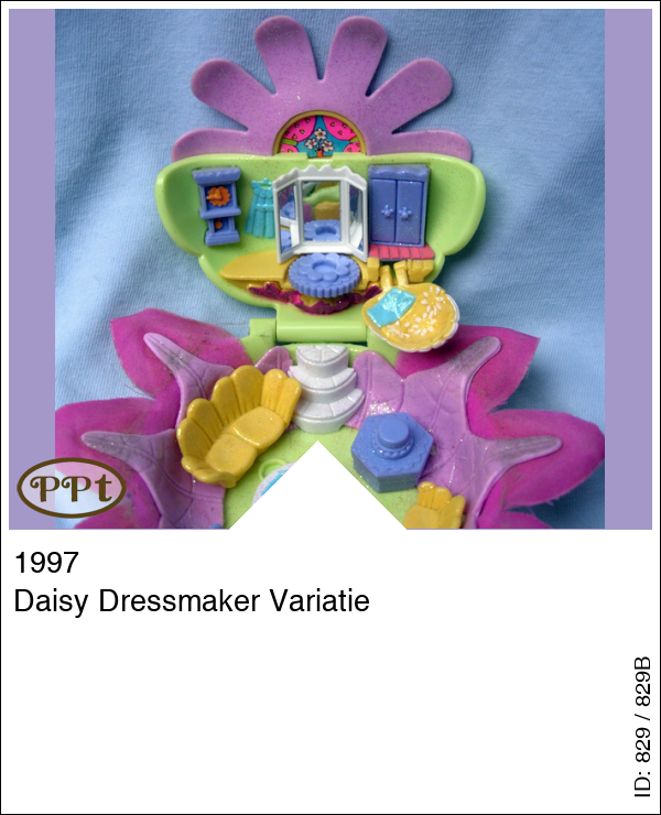 Deze leuke bloem met glitters verschuilt binnen een geweldig wereldje. Aan de ene kant zie je een tuintje en aan de andere kant een slaapkamer met spiegel, klok, bed, kast. In de midden van de bloem is een zithoek met overal glitter stoeltjes en gedekte tafel welke je eraf kan halen en aan de ander kant is weer de kniptafel. Met Polly, Daisy in paarse rokje en een los wit rokje en los geel rokje en Daisy in wit rokje.