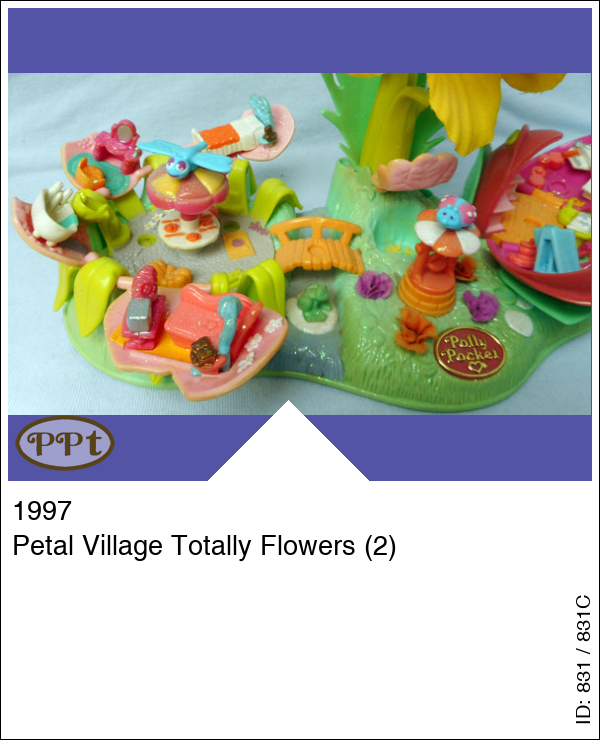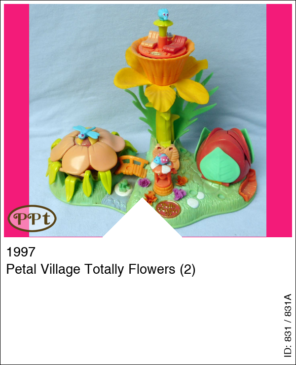 Dit zijn 3 bloemen en overal zie je glitters en kleine bloemetjes en een bruggetje over een slootje en onder de middelste bloem zit een bankje en daaronder zit een vakje. De eerste rose bloem kun je openklappen en onder elk bloemblaadje zit iets anders, een bedje, sofa met lamp en tv, een badje met wastafel en een kaptafel, in het midden is een picknicktafel met parasol allemaal met glitters. De rechtse bloem kun je eraf halen en openklappen en daaronder zit een kinderschooltje met verfspulletjes. De middelste bloem kun je naar beneden klappen daar zie je een bloemenzitje met tafeltje. Met libelle, de bij en het bovenkantje van de middelste bloem.