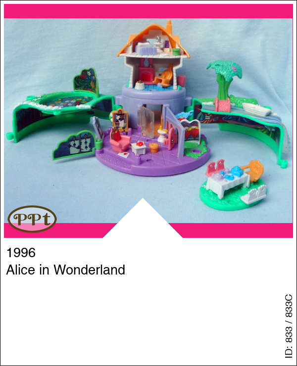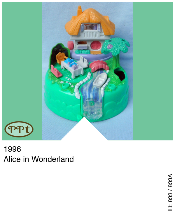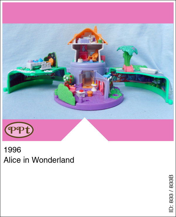 Een heuvel met daarop het witte huisje van wit konijn. Je ziet een watervalletje met roze bruggetje, wit bootje en een mooie glitterboom met de kolderkat, naast de boom een kuil waar je door kan springen en de theetafel met daaronder de bloementuin. Het huisje kan je omdraaien en daar zie je een schommelstoel, openhaard en een slaapkamer. Aan de achterzijde zit het konijnenholletje waar Alice doorgaat en dan komt ze terecht bij het tafeltje met de krimpkoekjes en de 3 deurtjes. Je ziet ook de rozentuin en de kaarten. En aan de andere kant zie je de rups, de tweeling en het bos met de kat.
