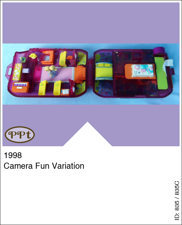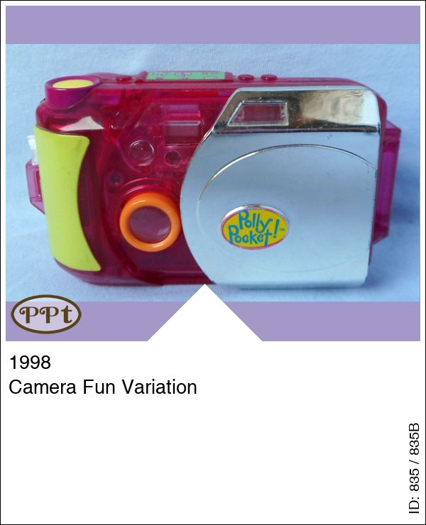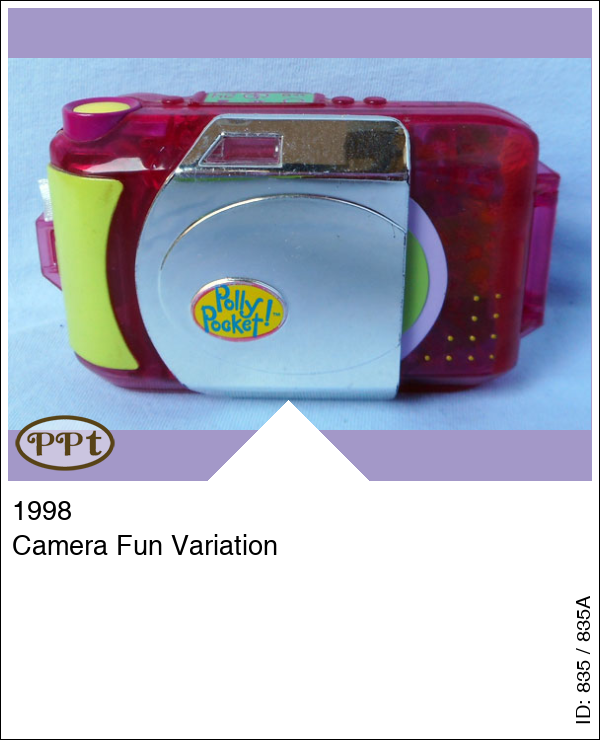 Fototoestel van doorzichtig rood/roze en als je op het knopje drukt brand er een lampje.