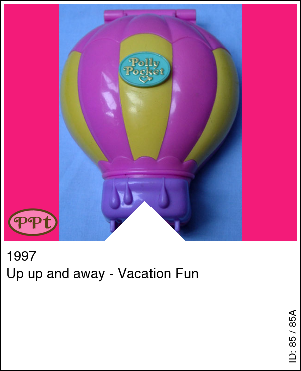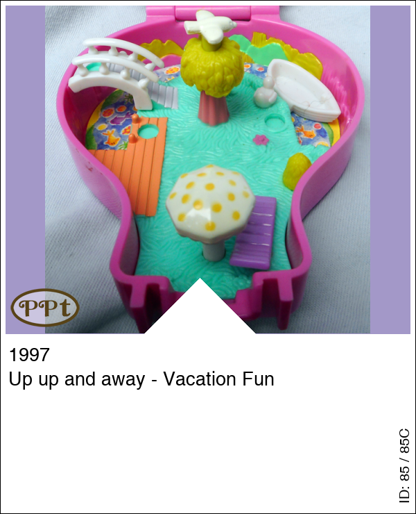 Up up and away - Vacation FunUpdate: 01-06-2023 Een luchtballon met een kleinere ballon en daarbinnen is een tuintje met beneden een vijvertje met bootje en een vogel op de boom. Met Polly en Lauren, de kleine ballon en het picknicktafeltje.