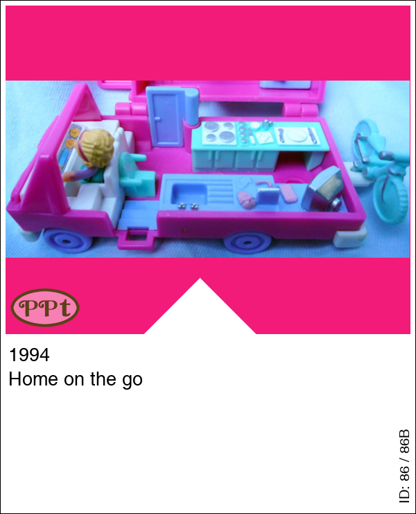 Een busje met daar binnenin een keuken, slaapkamer, douchebak en een picknicktafel. Het poppetje kan haar beentjes uit elkaar doen voor als ze een ritje gaat maken op de fiets.