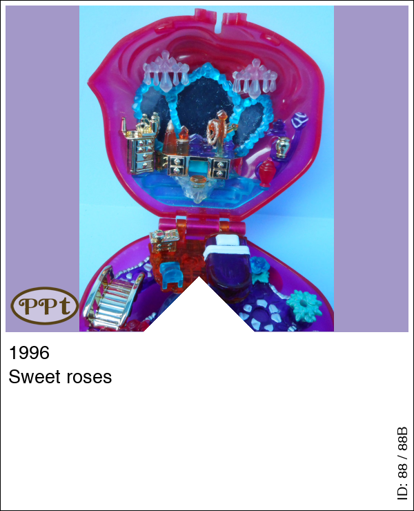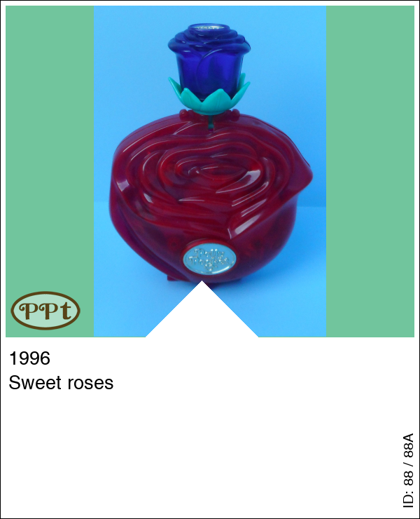 Een flesvorm met daarin een tuintje, beweegbaar visje en schommelstoeltje. Je kan in het dopje parfum doen en door het stokje eruit te halen de parfum smeren. Met Polly en 2 rode bloempjes en rode bloemvaasje en blauw bloemvaasje en 2 paarse bloempjes en 1 blauw bloempje.
