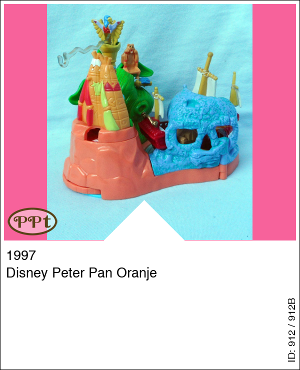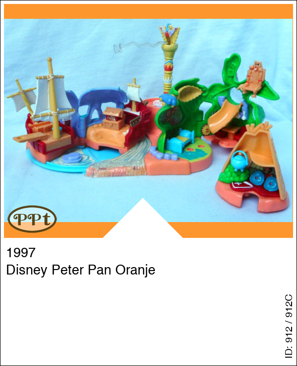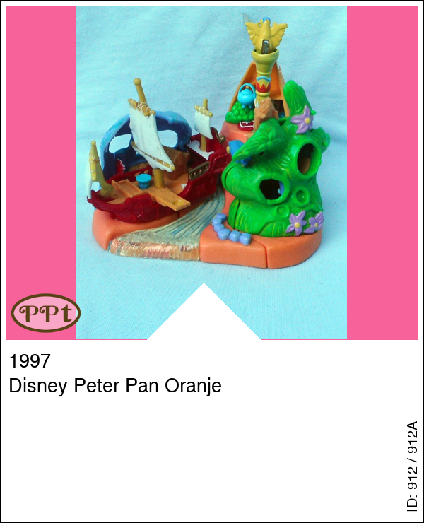 Deze kleurrijke pocket heeft vele mogelijkheden. Als het dicht is dan zie je een indianen tent met totempaal, een grot, en achter het doodshoofd het schip. Het schip kan je opendoen (door de helft)en dan zie je een kist en een stoel. Als je de grot/boom openmaakt dan zie je dat dit de schuilplaats is van Peter zijn vriendjes. Je ziet een glijbaan, stoel, hangmat met vogel, een bed, tafel en stoelen. Het tentje kun je eraf halen en daaronder zit een deken met kampvuur, in het tentje liggen kussens en hangt een kookpot. Als je aan de totempaal draait dan gaat de kist in het schip open. Met Peter Pan, Wendy, Michael, John, kapitein Haak, en de krokodil met bootje, Tinkerbell en de lamp.
