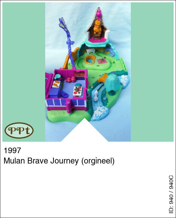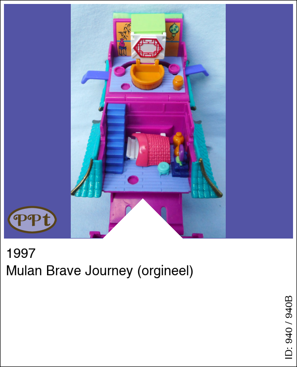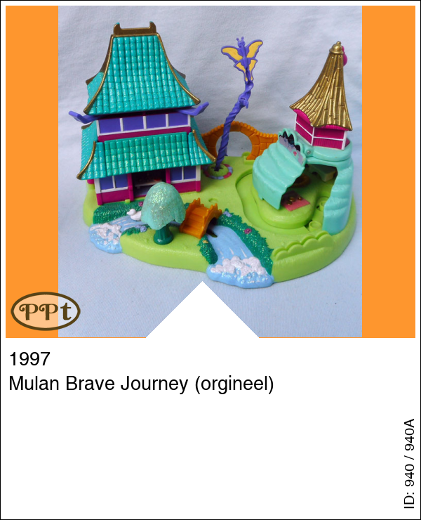 Een geweldige glitterende disney pocket. Voor de huisjes ligt een glitter rivier met eendjes en brug (de eendjes bewegen als je het boompje draait). Je ziet een vlinder vlieger met gele stukjes. Het rechtse huisje kan je omdraaien en dan zie je een draak, vijver met vissen waar ze omheen kunnen lopen en dan veranderen de vissen en een bankje. Het grote glimmende huis kan je in 2 gedeelten openklappen en daar is beneden een restaurant gevestigd. Een verdieping hoger is een slaapkamer met kaptafel en bed met beweegbare deken, ga je nog een trapje hoger dan is daar een soort van badkuip maar je kan het dichtdoen en er ook een kast van maken waar Mulan zich kan verkleden. Met 2 x Mulan in verschillende jurken, grootmoeder, Kapitein Shang, Mushu het draakje, Khan het paard.