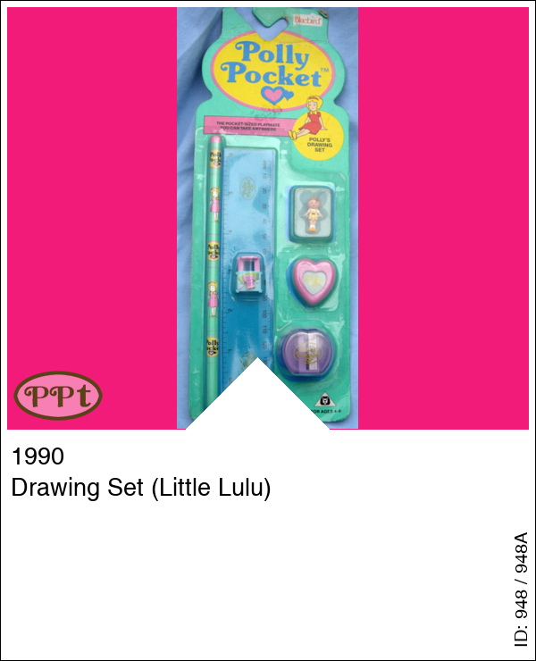 Dit is een schrijfset met Little Lulu, en bij haar zie je een lineaal met daarop een tafeltje en dit zit er vast op, gum (hartje), potlood en een puntenslijper.