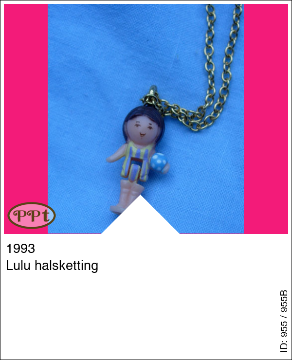 Leuke halsketting met daaraan lulu uit Beach Cafe 1993, ze heeft een bal in haar hand en een geel/blauw gestreept badpakje. Deze ketting kreeg je bij sommige verpakkingen van items van Polly Pocket er gratis extra bij.