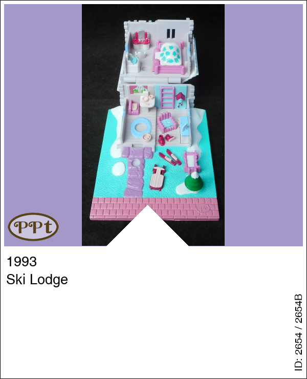 Een skihuisje met op dak een eekhoorn. Buiten zie je een slee, ski's en een dennenboom. Binnen zie je een woonkamer met open haard waar een stoel voor staat en er liggen laarzen, een zithoekje en de trap naar de bovenverdieping, boven is een bedje met deken waar dennenboompjes op staan, je ziet een kaptafel en wastafel. Met Polly, Lulu en Nellie de St. Bernhards hond.