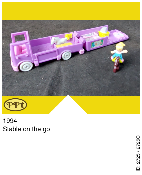 Dit is een paars busje wat paardjes vervoert. Als je het dak openklapt zie je een ruimte voor de paardjes met een klepje wat naar beneden kan en de paardjes eruit kunnen lopen, als je naar de andere zijde gaat is een kussenzithoek met tv en een keukenblokje en zithoekje met tafel en 2 stoelen. Polly en 1 wit paardje en 1 bruin paardje met geel zadel.