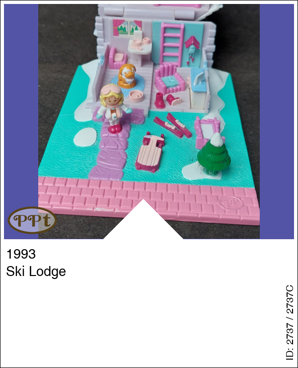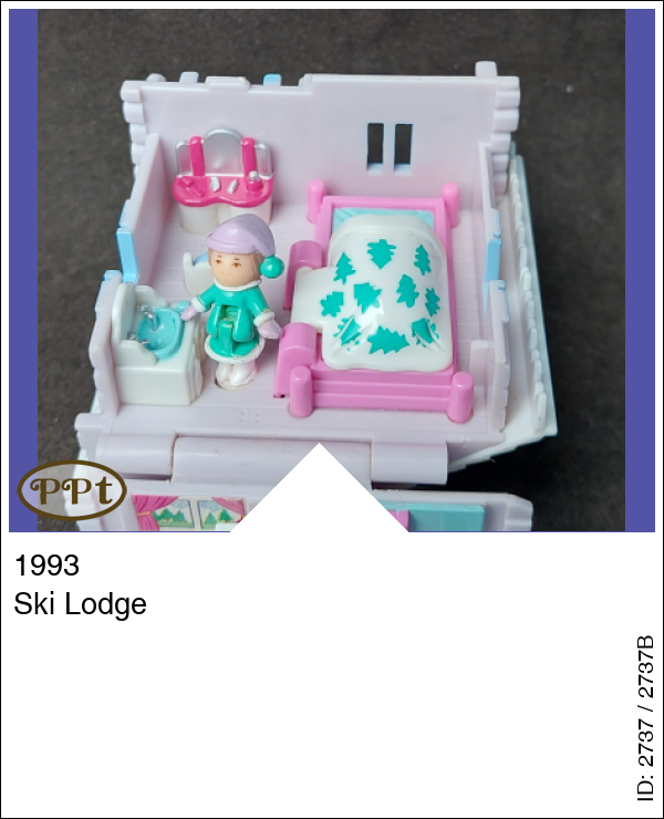 Een skihuisje met op dak een eekhoorn. Buiten zie je een slee, ski's en een dennenboom. Binnen zie je een woonkamer met open haard waar een stoel voor staat en er liggen laarzen, een zithoekje en de trap naar de bovenverdieping, boven is een bedje met deken waar dennenboompjes op staan, je ziet een kaptafel en wastafel. Met Polly, Lulu en Nellie de St. Bernhards hond.