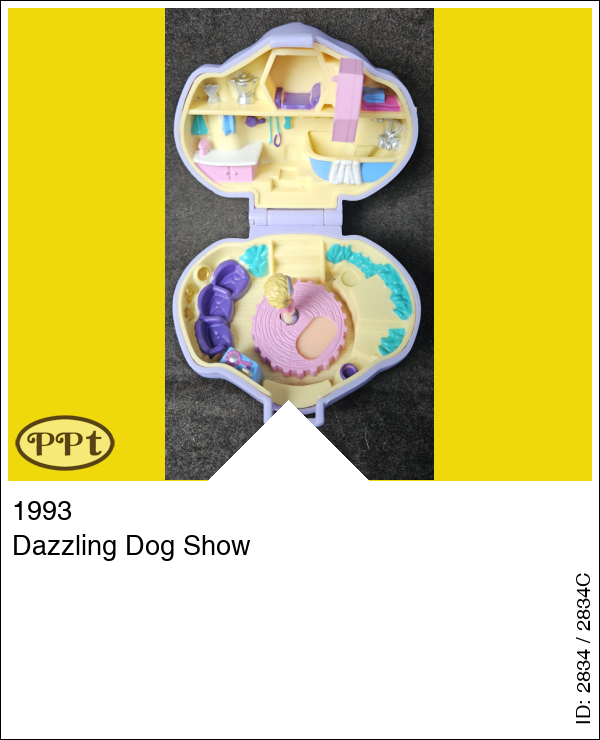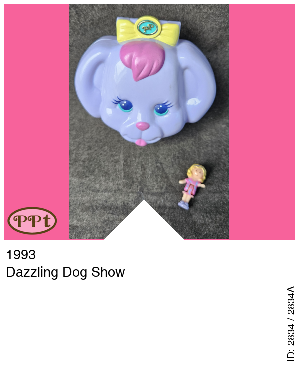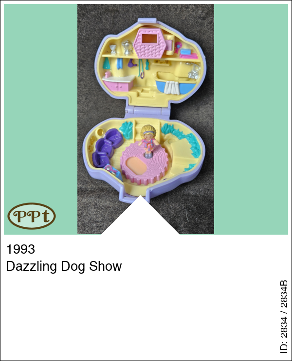Een doosje in de vorm van een hondenkopje. Binnen in is bovenin een hondenhokje waarvan het deurtje open kan en een wasruimte voor de hond met badje. Beneden is een draaischijf waar Polly met hondje op kan staan en ze haar hond kan showen voor publiek. Met Polly.
