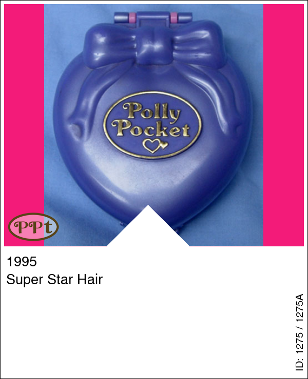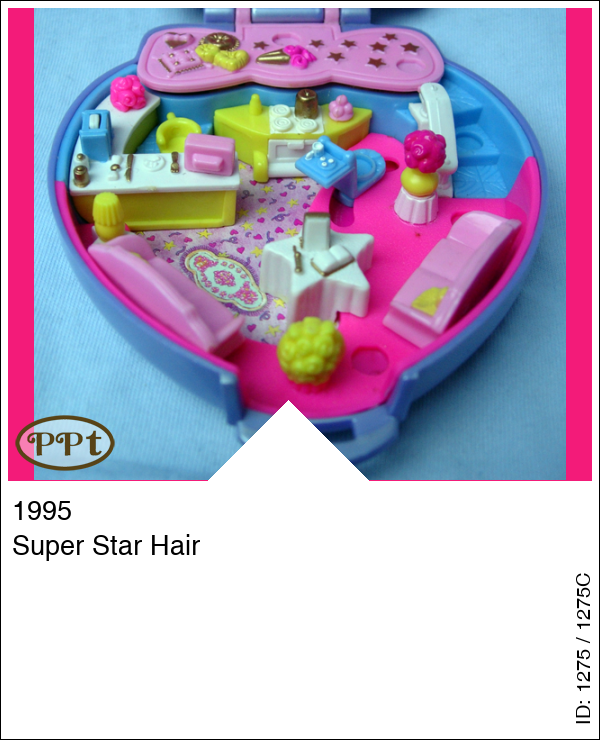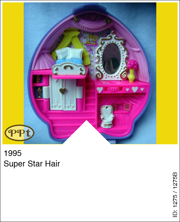 Dit doosje heeft aan de buitenkant een strik, en binnenin is een leuk druk doosje met overal verrassingen. Beneden onder het podium is een kussenruimte waar je lekker kunt zitten, een verrijdbaar karretje, in de keuken is een tosti apparaat waar als je met het stoeltje draait de tosti uit komt, het gasfornuis kan open. Boven zie je een kast waarvan je de deurtjes open kan doen en je ziet een bed en grote spiegel, ook daar kan Polly voor gaan staan en kun je ze laten draaien. Leuk doosje. Met Polly, gele haarspeldje, roze haarspeldje, blauw borsteltje.