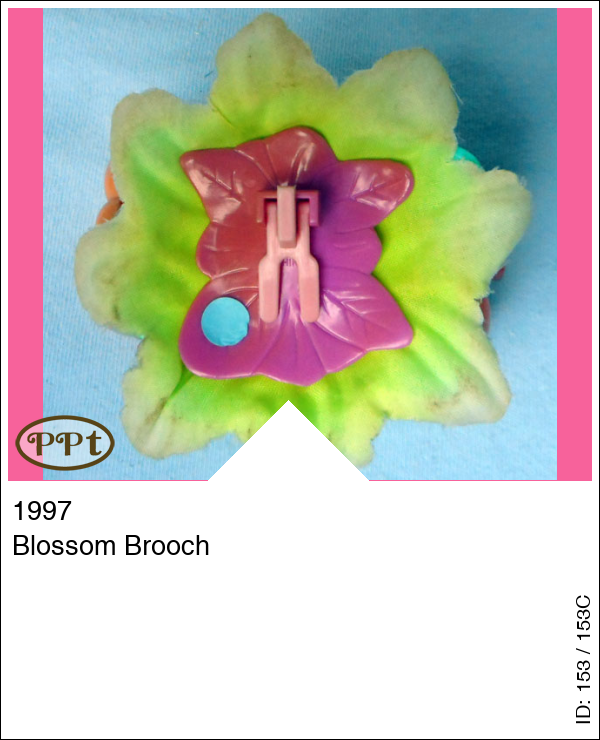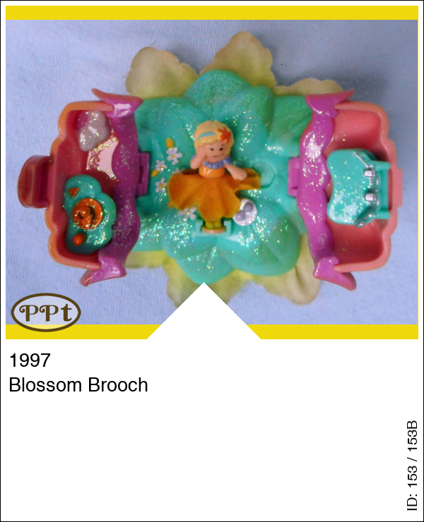 Blossom BroochUpdate: 01-03-2023 Het is een broche met veel glittertjes, binnen in zie je een kaptafel en een gedekte tafel. Polly met geel rokje.