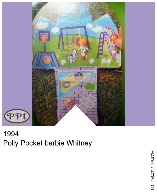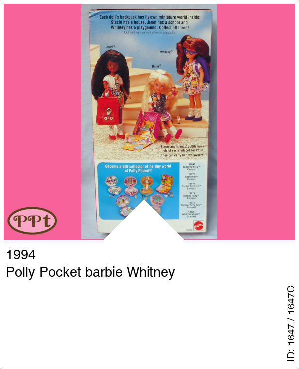 Whitney is een Speciale uitgave van Mattel met 3 polly pocket poppetjes welke ze in haar zakken van haar jurk kan doen. Ook heeft ze een tas bij zich waarop je voorop ook een polly pocket poppetje kan stoppen en als ze de tas open doet kan ze spelen met de popjes want daar zie je een speeltuin.