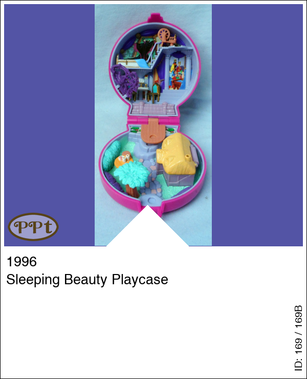 Een roze doosje met voorop Doornroosje en Prins Charming. Binnen zie je aan de bovenkant het spinnenwiel, bed en de doornstruik hierachter staan 2 stoelen en 1 tafel met kandelaar, De plaatjes zijn de 3 feeen, vader en moeder bij de wieg. Op het andere plaatje staat de boze fee.